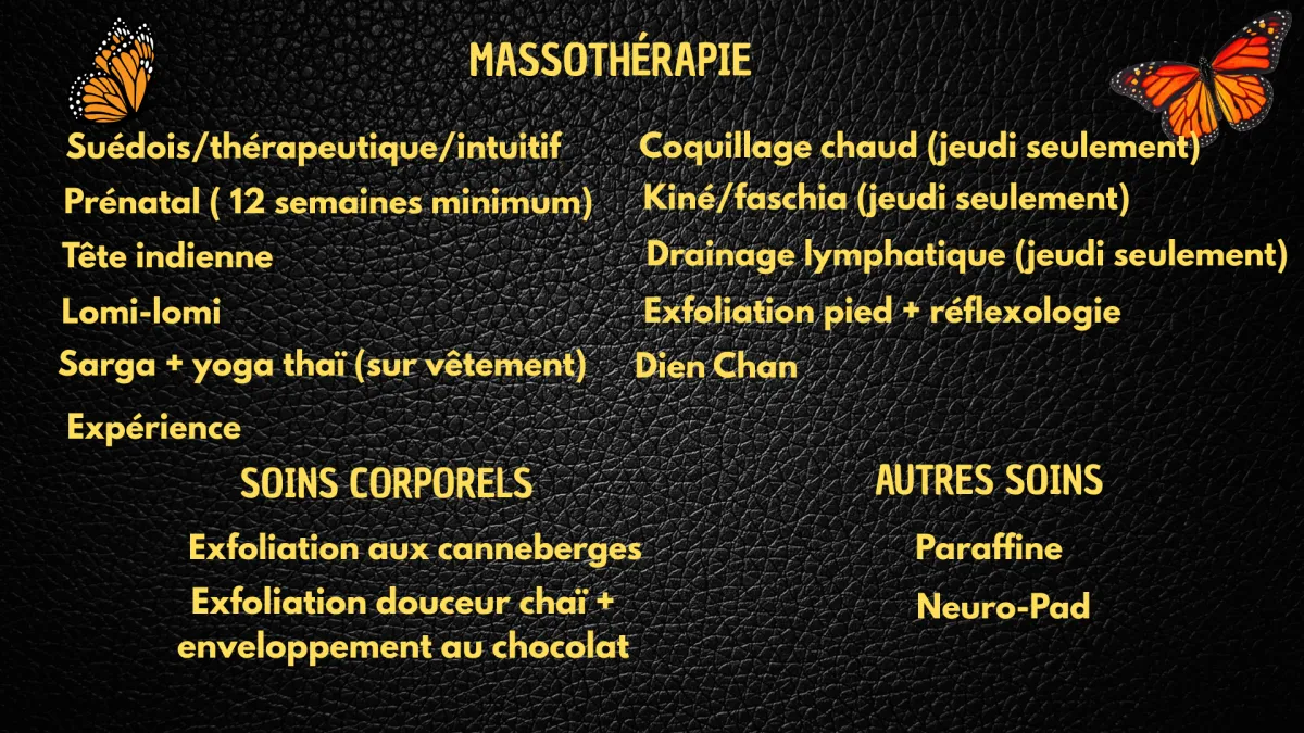 Tu peux réserver directement en ligne via notre plate-forme (lemonarque.ca) pour les soins de massothérapie, soins corporels et esthétique. Je t`invite à nous appeler si tu as des questions.