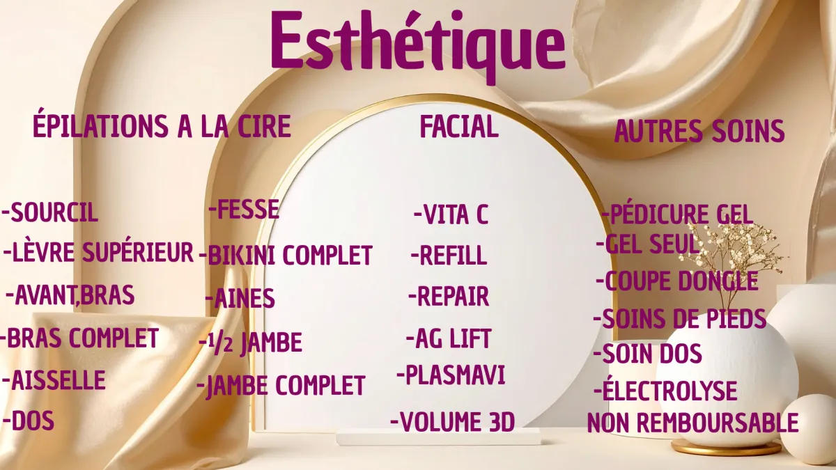 *Esthétique (facial, pédicure, épilations, électrolyse,teinture cils, soins de dos)